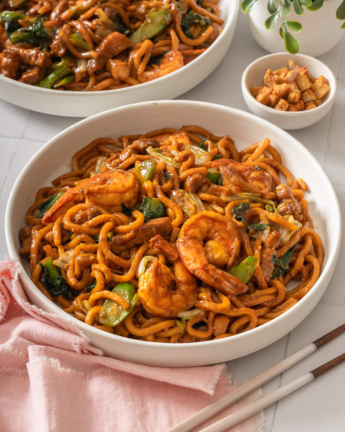 Sweet, savory, smoky Hokkien mee with thick, glossy stir-fried noodles, crispy pork belly, and shrimp in less than 20 minutes! This incredibly delicious Malaysian dish is so easy to make for your next weeknight dinner.
