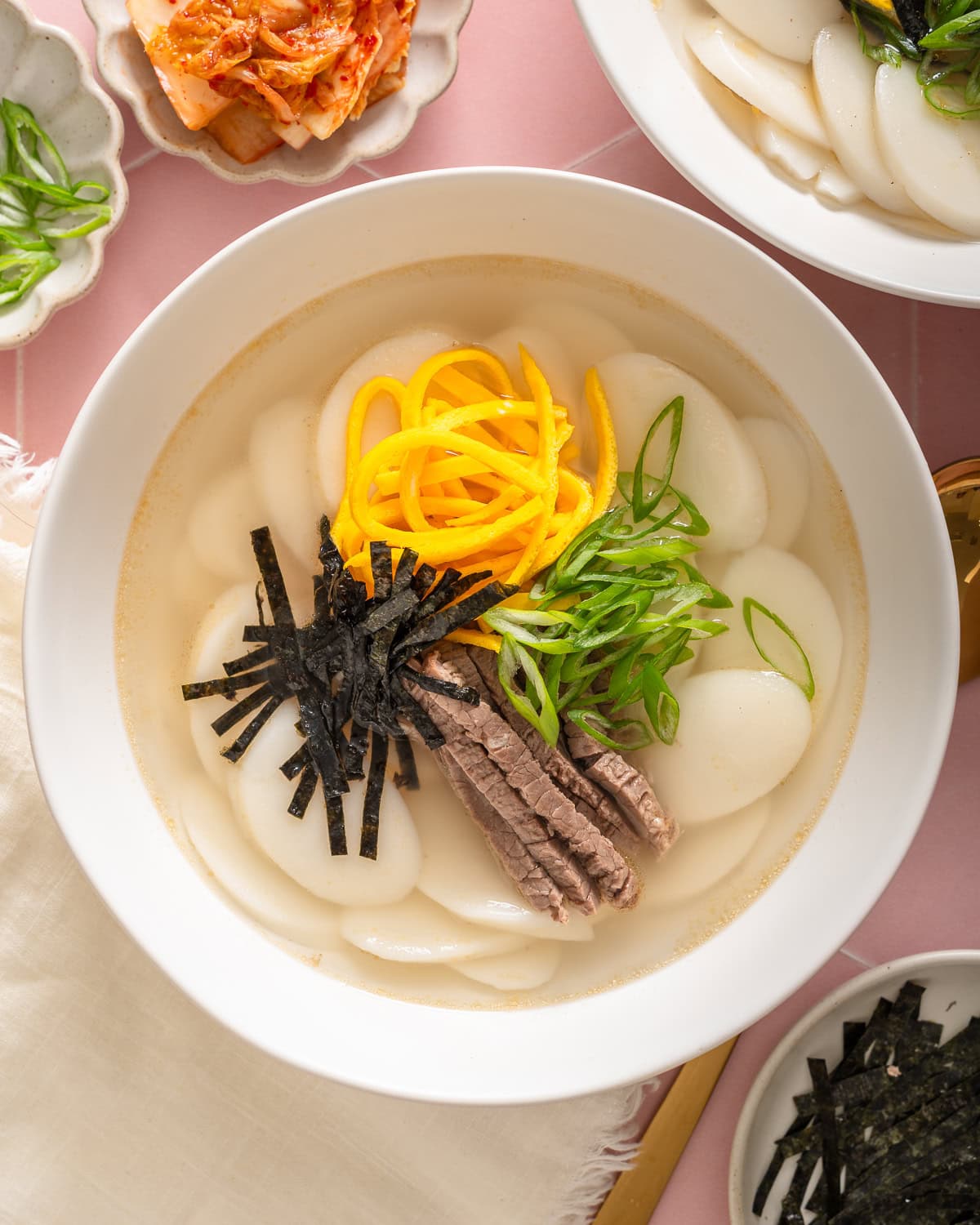Garnish the tteokguk with the egg strips, seaweed and green onion.