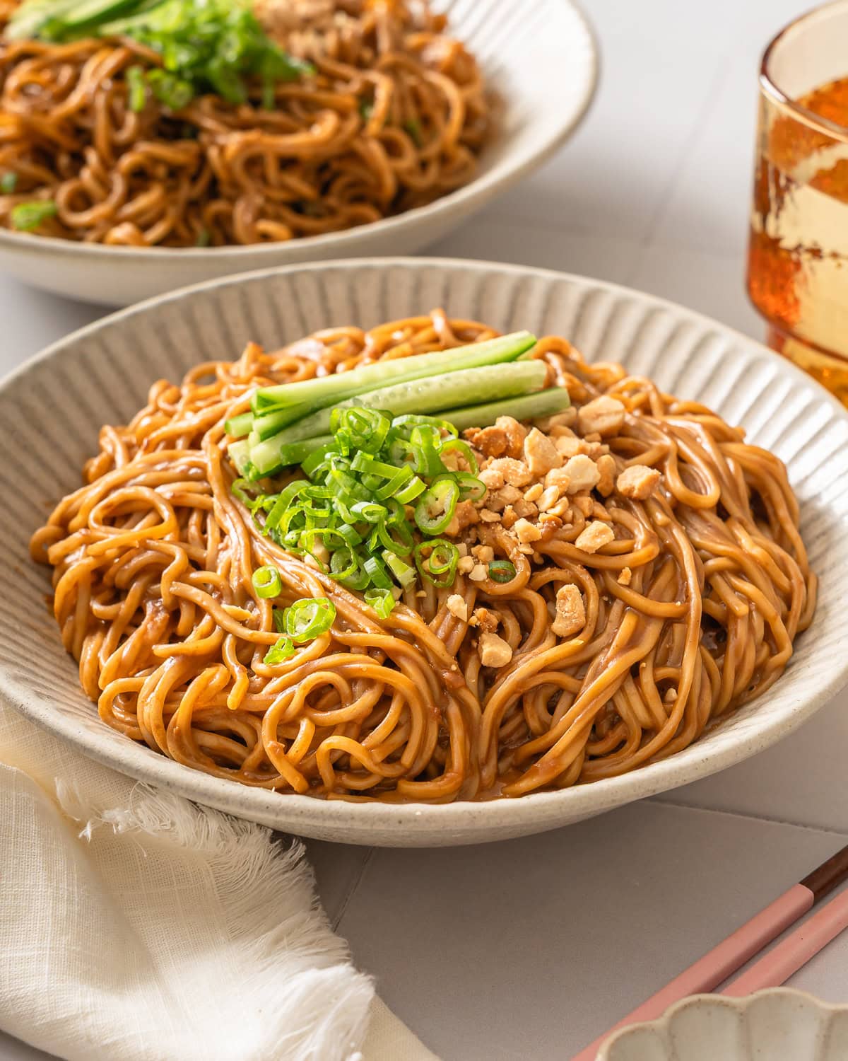 Sesame noodles are a Chinese-American savory noodle dish made with sesame paste, peanut butter, light and dark soy sauces, black vinegar, chili oil, sesame oil, garlic, and ginger. They are often served room temperature or cold, garnished with fresh cucumbers and green onions.