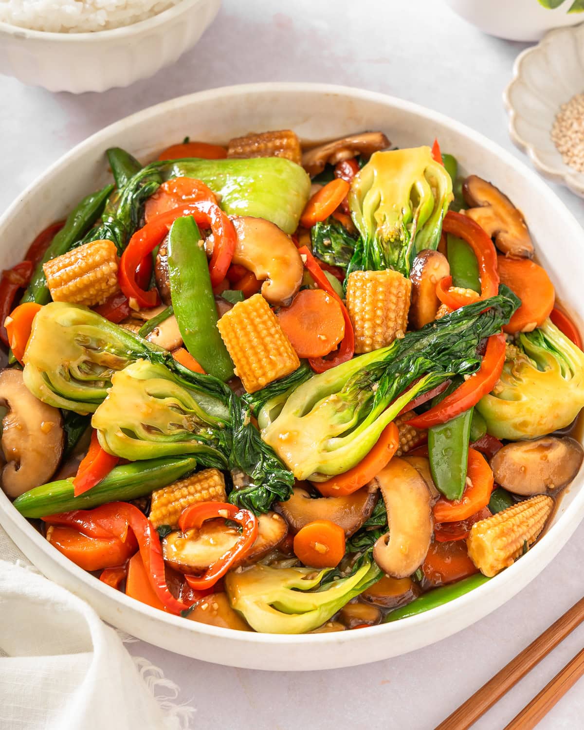 This easy stir-fry recipe features colorful veggies tossed in a glossy Chinese-style savory stir-fry sauce. Toss in whatever you have in the fridge, and this dish is ready in under 15 minutes!