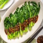 Crisp, tender, and savory dark leafy greens tossed with a succulent, brown, and glossy garlic sauce. This simple Chinese choy sum recipe requires only a handful of ingredients to create a healthy and delicious side dish in less than 10 minutes.